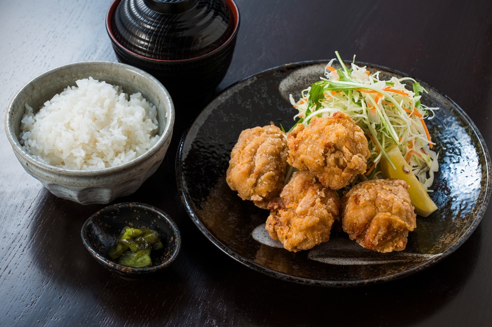 《唐揚げ・サラダ・ご飯・味噌汁・漬物》